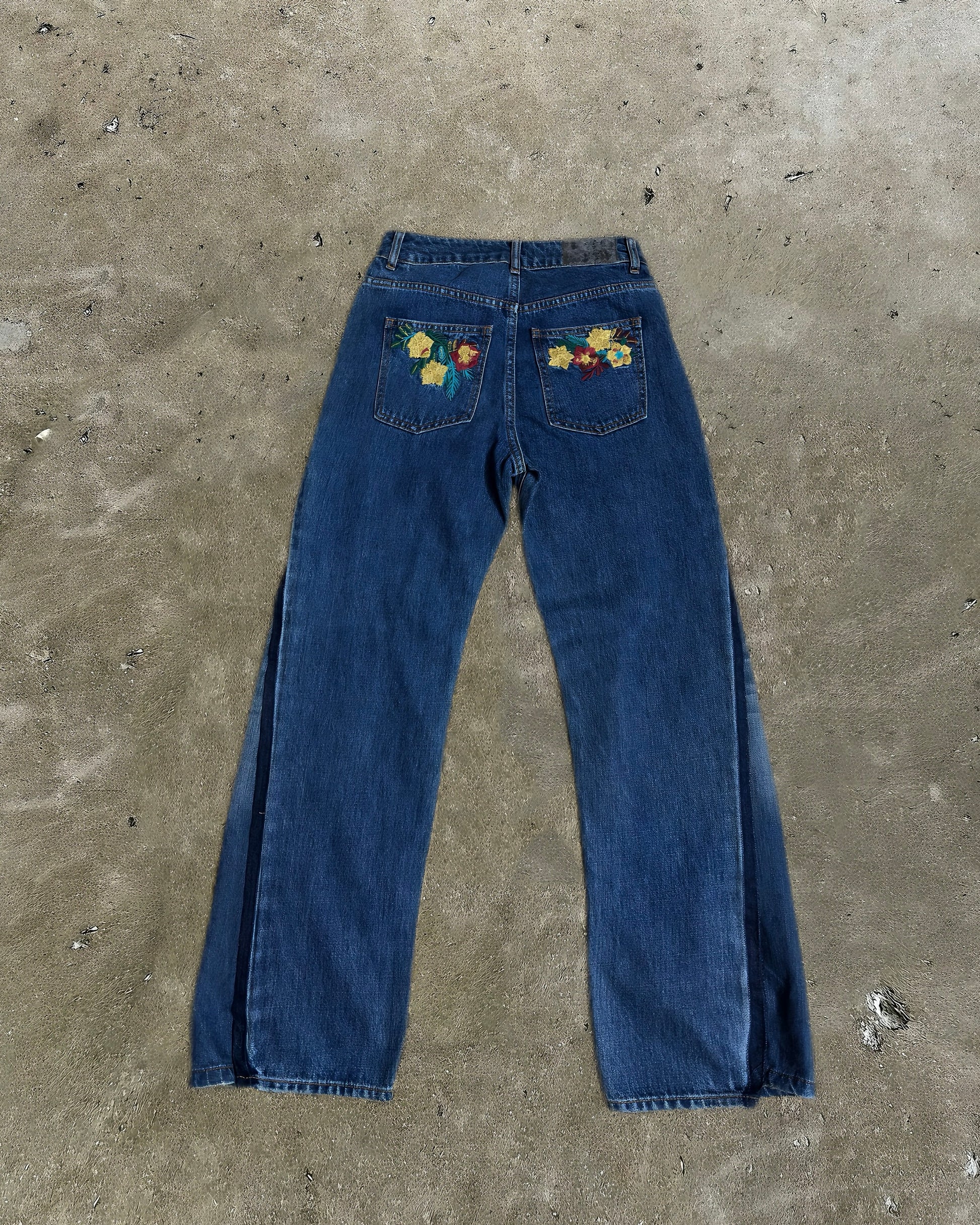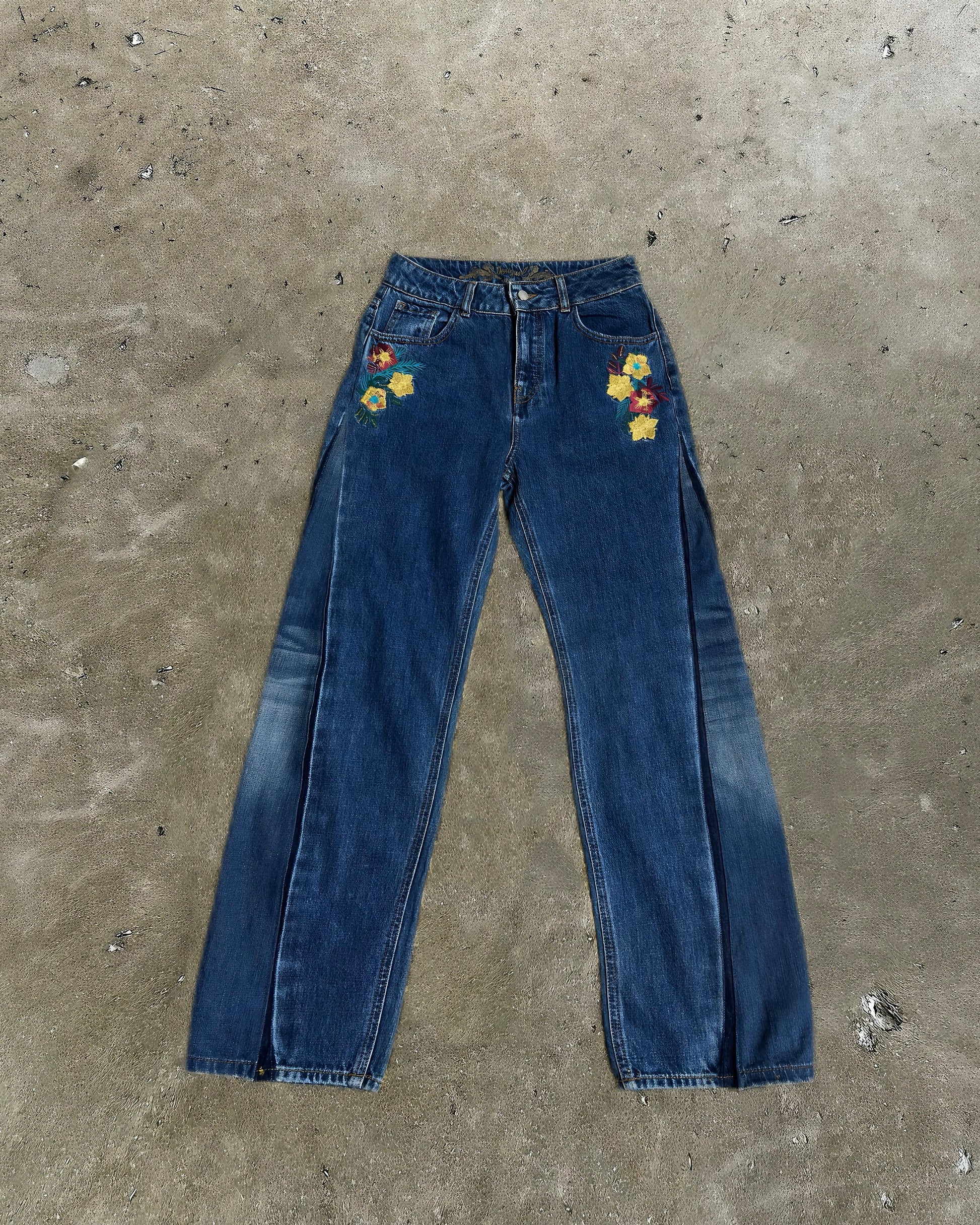 High-waist straight-leg denim in a deep indigo wash, featuring vibrant floral embroidery on the front and back pockets. A blend of retro charm and modern flair, perfect for adding a playful yet chic vibe to casual outfits. 🌼🌸