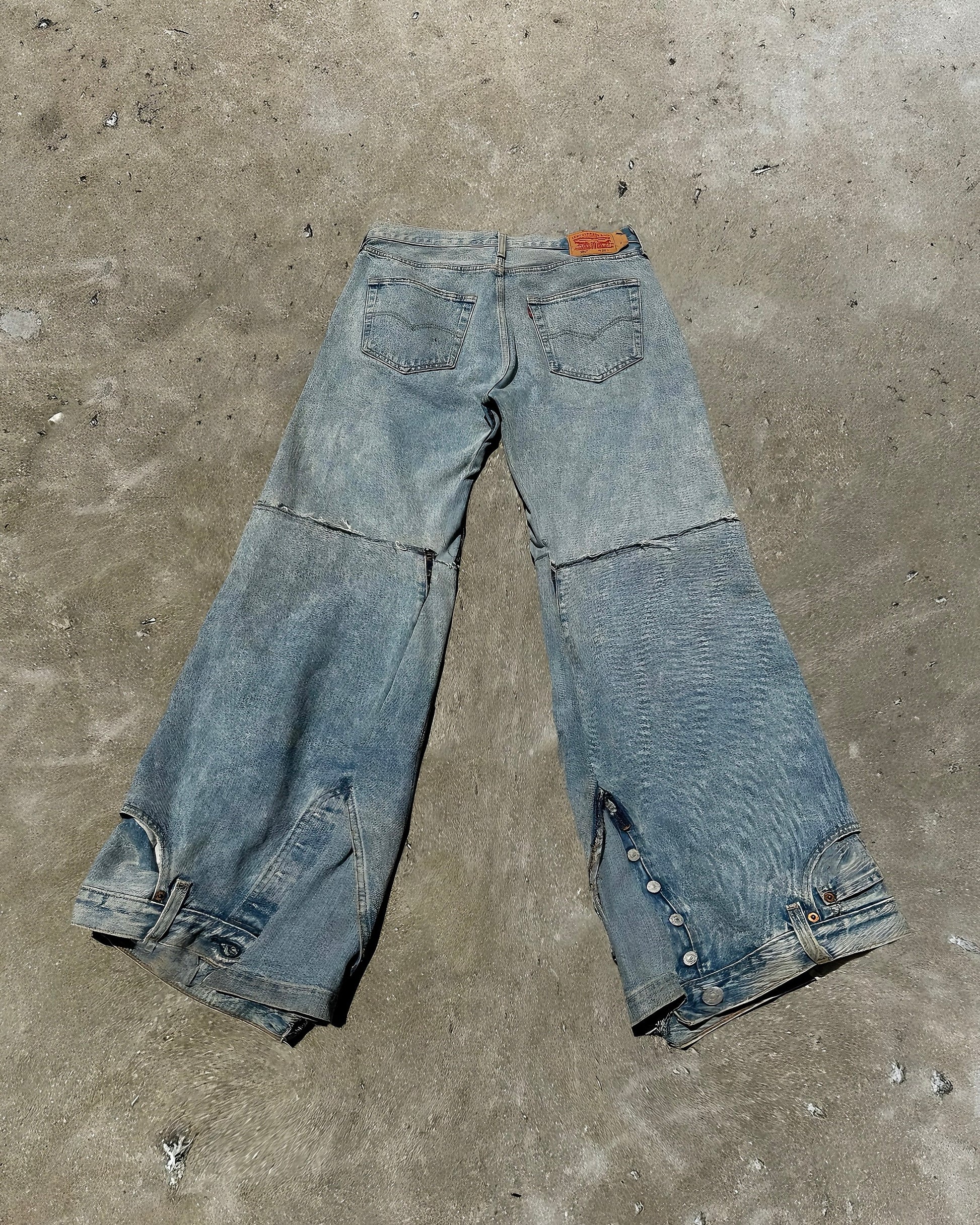 One-of-a-kind reworked Levi’s denim, crafted from vintage jeans with extended length and wide leg cut. Features two oversized back pockets placed on the front for a bold, utilitarian edge. Distressed details and a raw washed finish make this piece stand out as a true archive-style statement.
