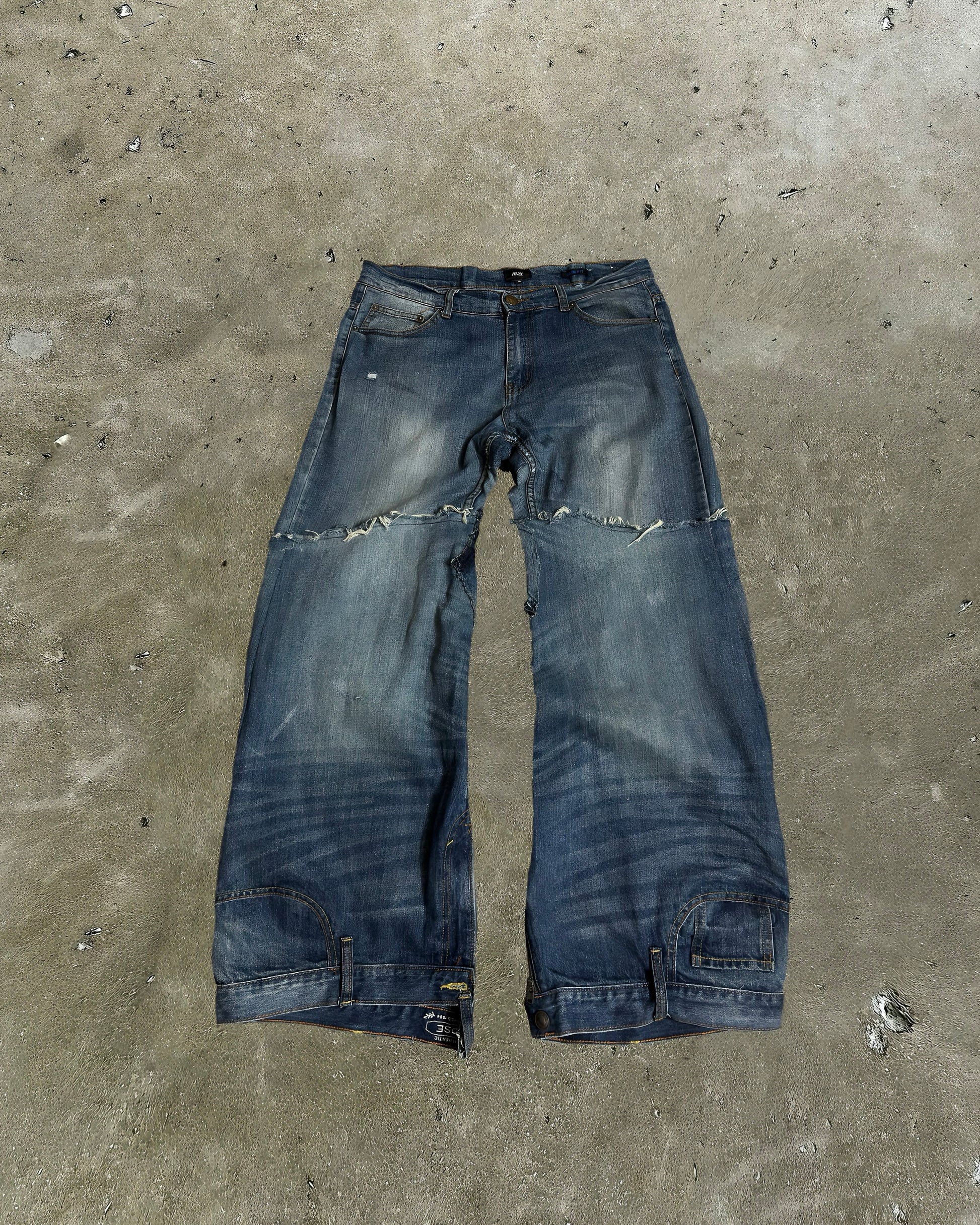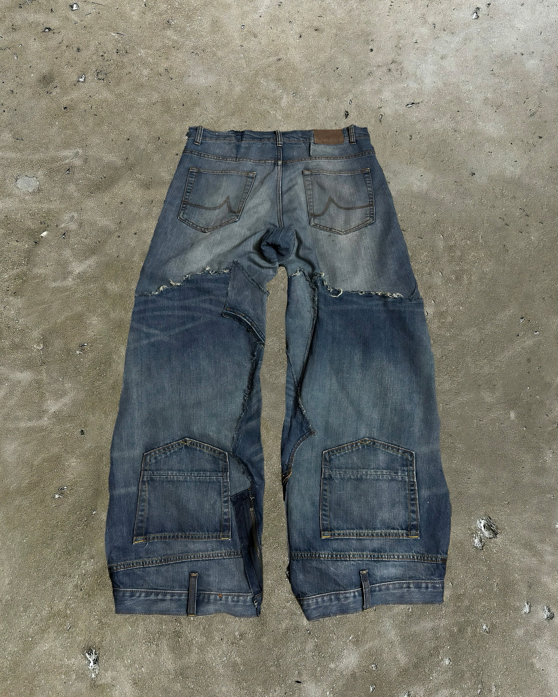 Handcrafted from two vintage denim shorts fused into one bold design. Featuring raw cut lines across the thighs, distressed fading, and oversized utility pockets at the back. Wide-leg silhouette with heavy washed texture for a rugged, lived-in look.